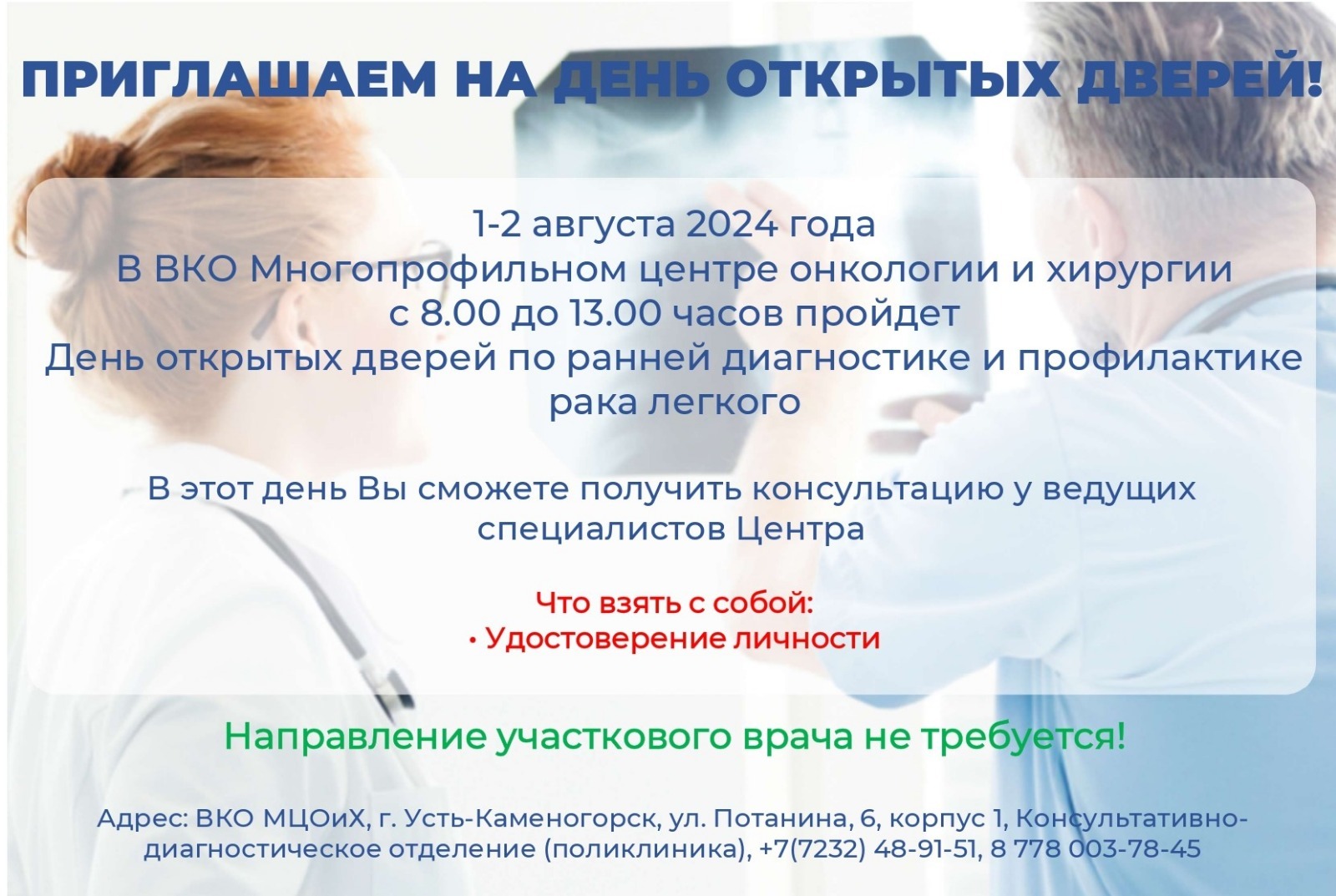1 и 2 августа с 08.00 до 13.00 в ВКО Многопрофильном центре онкологии и хирургии состоится очередной День открытых дверей по ранней диагностике и профилактике рака легких.